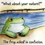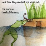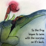 But if you don’t know the story… In the original the scorpion stings the frog in the middle of the river. When the frog asks “why” the scorpion says “it’s in my nature” and they both die. I like my ending more.